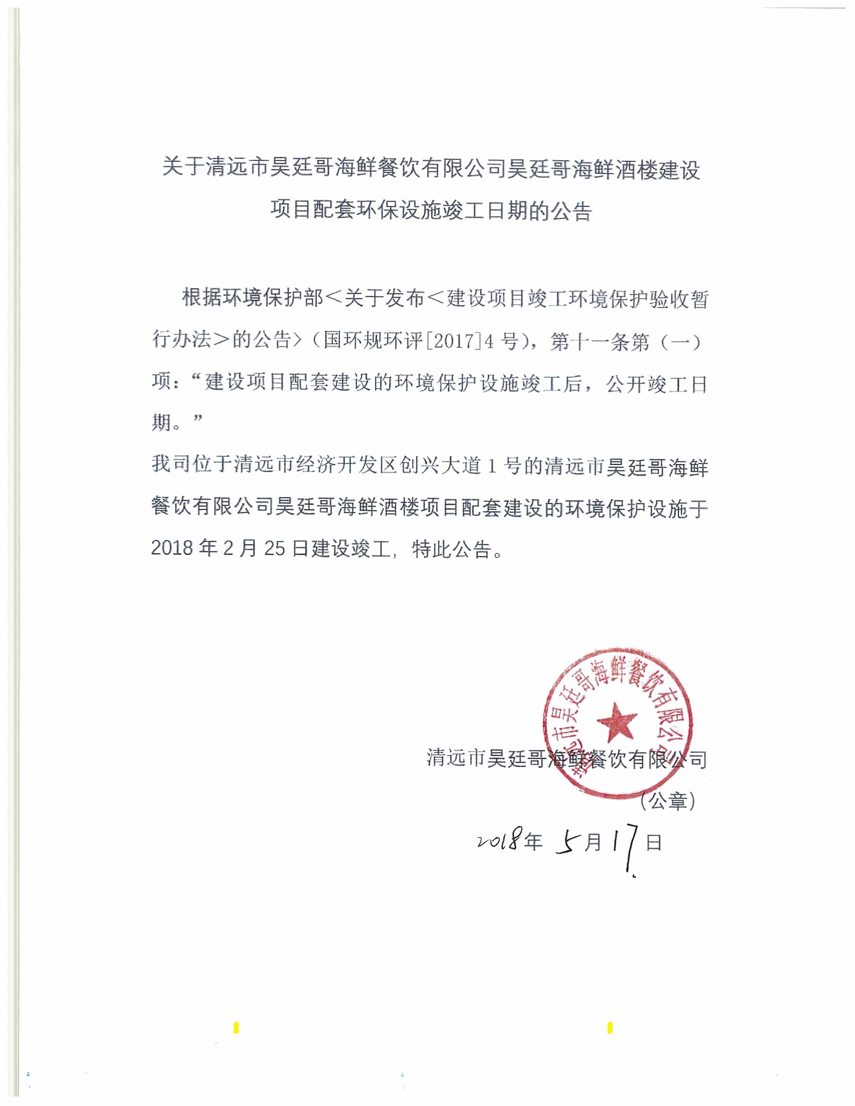 關(guān)于清遠(yuǎn)市昊廷哥海鮮餐飲有限公司昊廷哥海鮮酒樓建設(shè)項(xiàng)目配套環(huán)保設(shè)施竣工日期的公告.pdf